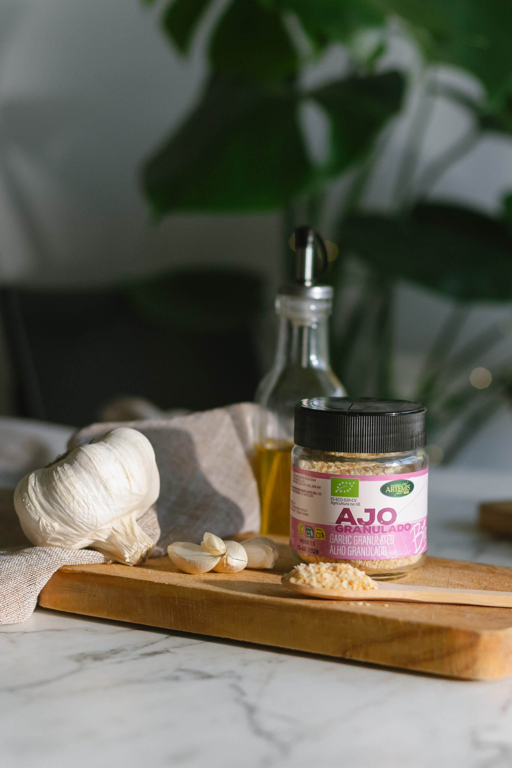 El tarro grande de ajo contiene ajo deshidratado con un sabor intenso y aromático. Perfecto para sazonar carnes, salsas, guisos y aliños.