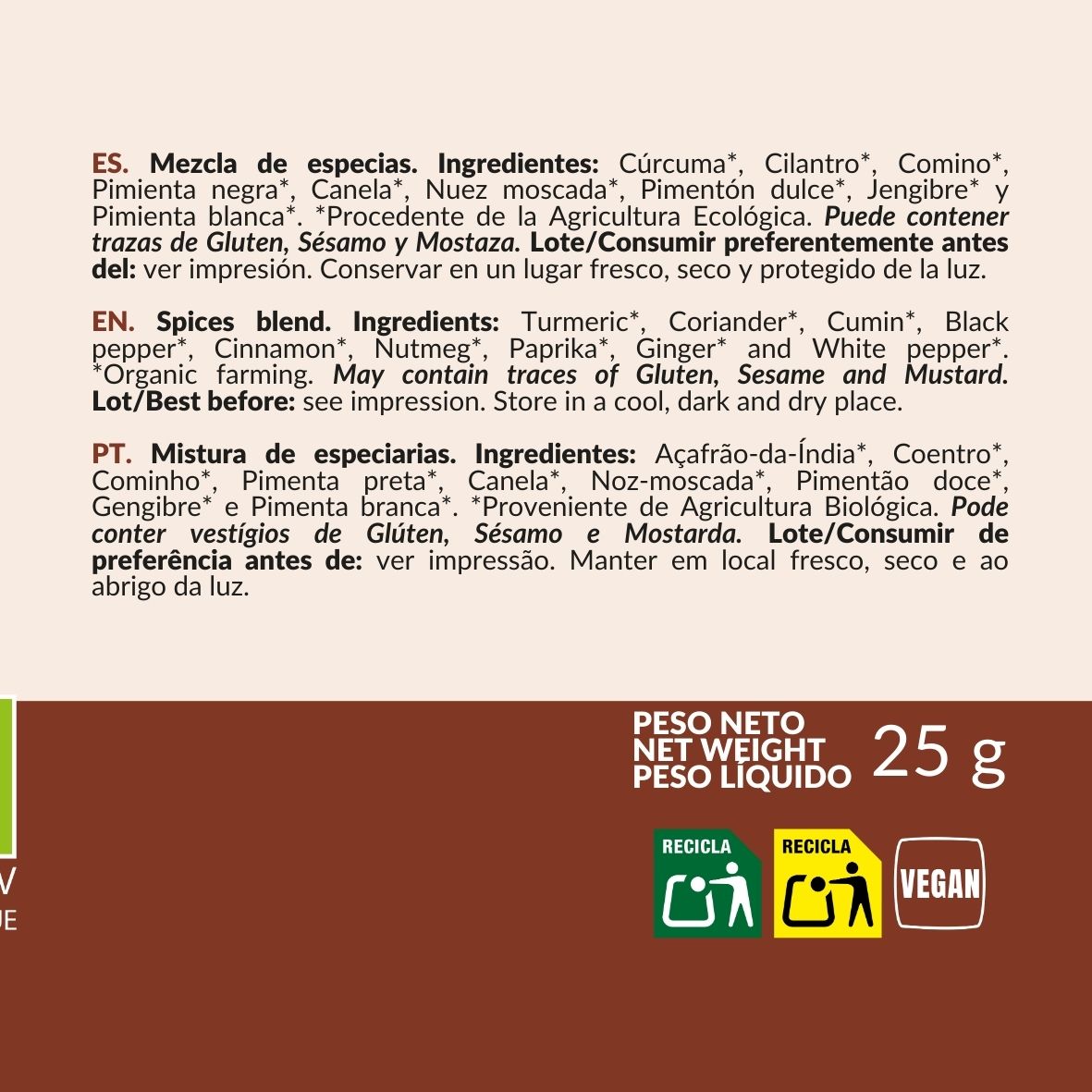 Ingredientes: Cúrcuma*, cilantro*, pimentón dulce*, canela*, comino*, pimienta negra*, nuez moscada*, jengibre* y pimienta blanca*.